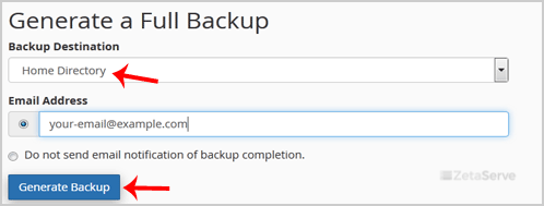 4. From the dropdown menu, select the backup destination as "Home" and enter your email address in the e-mail field so that you can receive notification when the backup is complete.