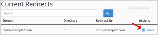 3. Scroll down to the end of page and under "Current Redirects" locate the domain and click on the "remove" icon.