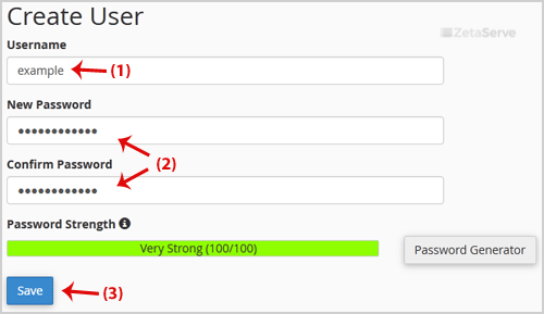 7. Scroll down the page and under "Create User" fill in the username and password fields or use the Password Generator option to generate a new random password and copy the user/password to a notepad. You will need this when you want to open your password-protected directory and click on the "Save" button.
