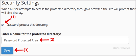 5. Under "Security Settings", check the box next to "Password protect this directory" and enter a name for the protected directory like "Password Protected Area". Then click the "Save" button.