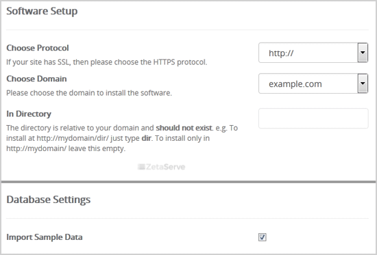 - In Directory: If you want to install this in a directory, for example example.com/directory, enter the directory name. Otherwise, leave this blank to install in your main domain example.com