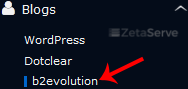4. On the left side of your screen you should locate the "Blogs" category. Click on it and then click on the "b2evolution" link that will appear.